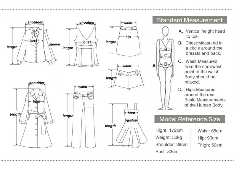 | NOTE: 1. Please strictly follow the size chart to select the size. Do not select directly according to your habits. 2.Still not sure about size? We’d love to advise based on your measurements of bust, waist and hip. 3. The size may have 2-3cm differs due to manual measurement. Please note when you measure. 4. Suggestion of cold water hand washing. It can help items keep their shape. 5. 1inch =2.54cm 6. Suitable for weight :40kg-75kg Hight :152cm-175cm | |||||||||